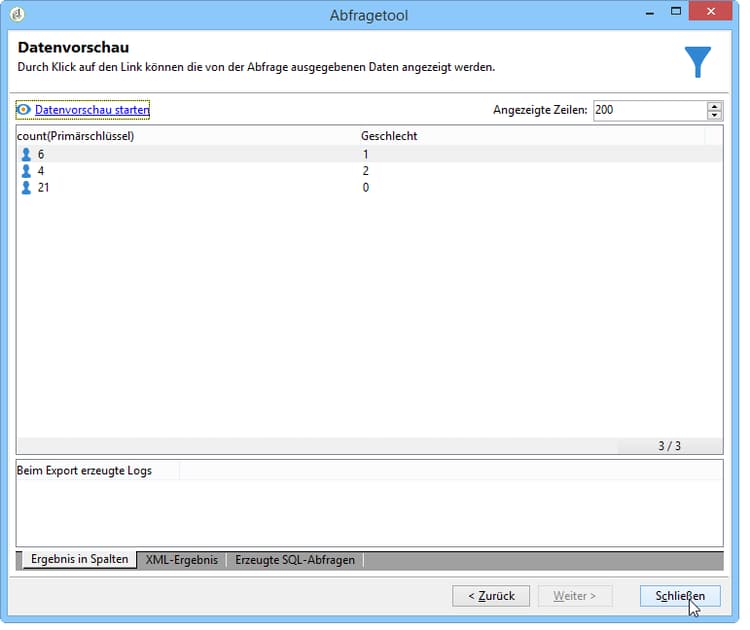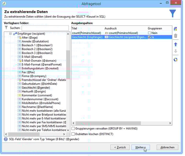 Konfigurieren Sie im Fenster Zu extrahierende Daten wie im vorangehenden Beispiel eine Primärschlüssel-Zählung. Fügen Sie das Feld Geschlecht zu den Ausgabespalten hinzu. Kreuzen Sie die Option Gruppieren der Spalte Geschlecht an. Auf diese Weise werden die Empfänger nach Geschlecht angeordnet.