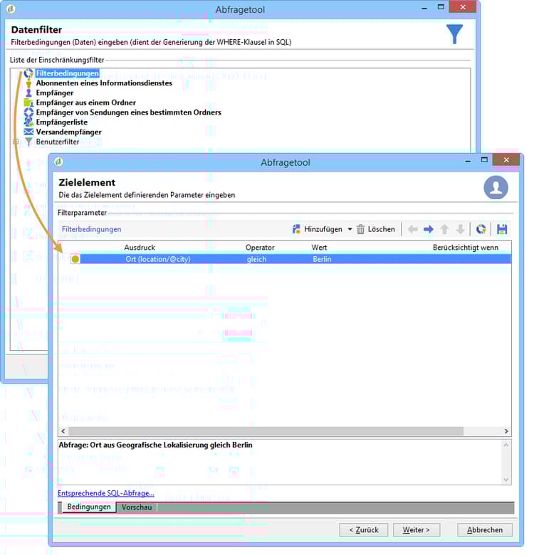 Konfigurieren Sie nun die Filterbedingung. Hier soll die Auswahl auf Empfänger beschränkt werden, die in Berlin wohnen.