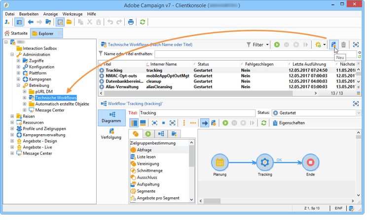 Gehen Sie in den Knoten Administration > Betreibung > Technische Workflows und erstellen Sie einen neuen Workflow.