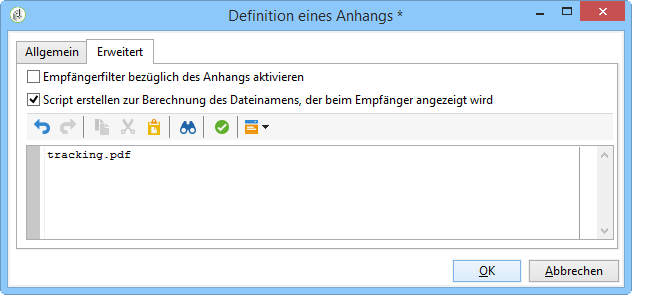 Wählen Sie die Registerkarte Erweitert aus und markieren Sie Script erstellen zur Berechnung des Dateinamens, der beim Empfänger angezeigt wird. Geben Sie im Eingabefeld den Namen für den Anhang im endgültigen Versand ein.