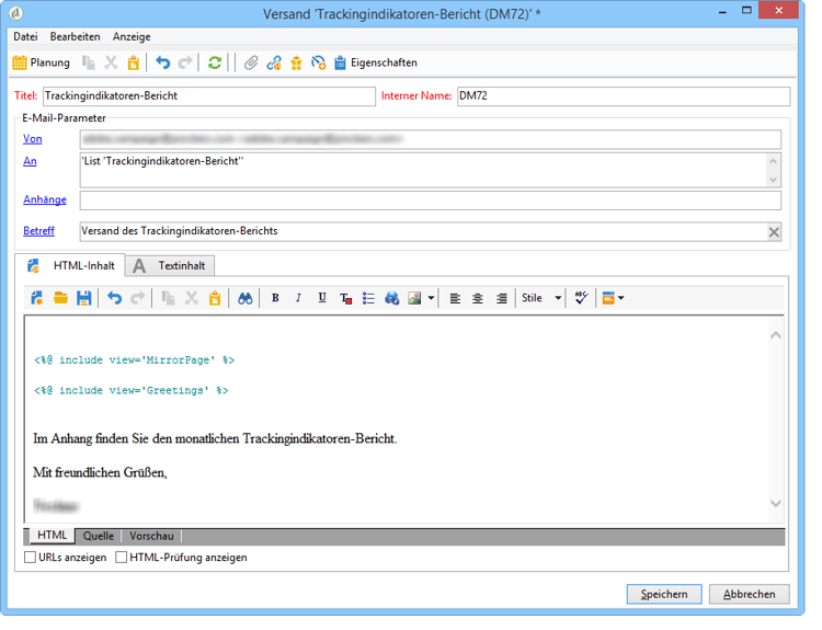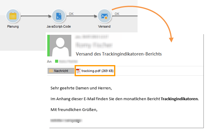 Im folgenden Anwendungsbeispiel soll jeden Monat der Standardbericht zu den Trackingindikatioren erzeugt und als PDF an eine Empfängerliste gesendet werden.