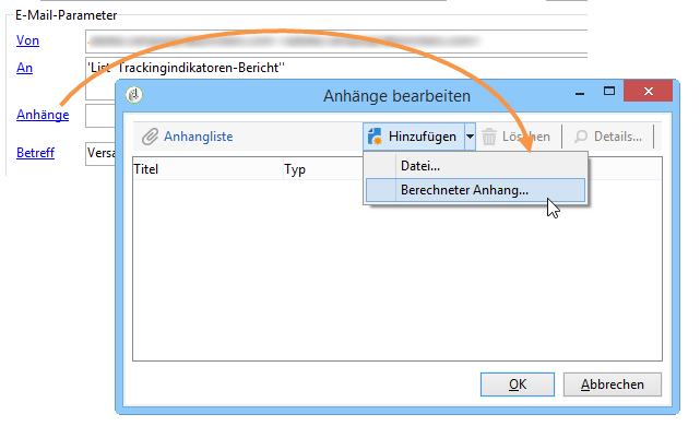 Bei jeder Ausführung des Workflows wird der Bericht zu Trackingindikatoren aktualisiert (siehe 3. Schritt: Erstellung des Workflows). Um die neueste Version des Berichts in den Versand einzubeziehen, müssen Sie einen berechneten Anhang hinzufügen: