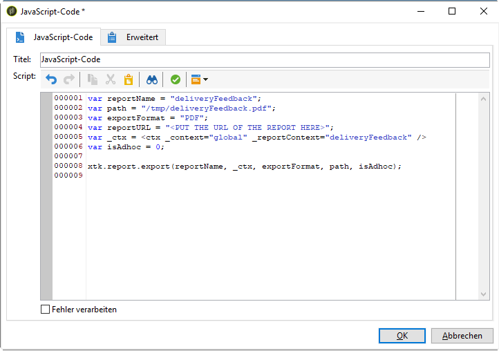 code language-none var reportName = "deliveryFeedback"; var path = "/tmp/deliveryFeedback.pdf"; var exportFormat = "PDF"; var reportURL = "<PUT THE URL OF THE REPORT HERE>"; var _ctx = <ctx _context="global" _reportContext="deliveryFeedback" /> var isAdhoc = 0; xtk.report.export(reportName, _ctx, exportFormat, path, isAdhoc);Hierbei werden folgende Variablen verwendet: