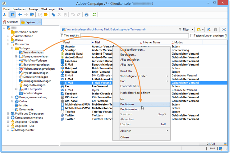 Gehen Sie im Adobe Campaign-Explorer zum Knoten Ressourcen > Vorlagen > Versandvorlagen und duplizieren Sie die vordefinierte Vorlage E-Mail-Versand.