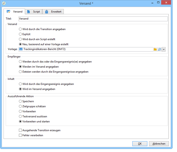 - Erstellung einer Versandvorlage, die bei jeder Workflow-Ausführung einen neuen Versand erzeugt (siehe 2. Schritt: Erstellung der Versandvorlage).