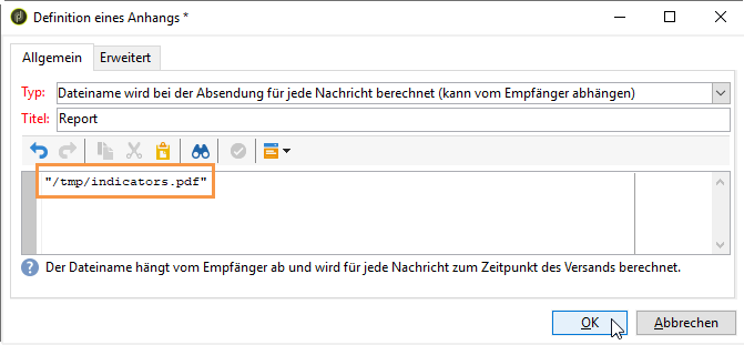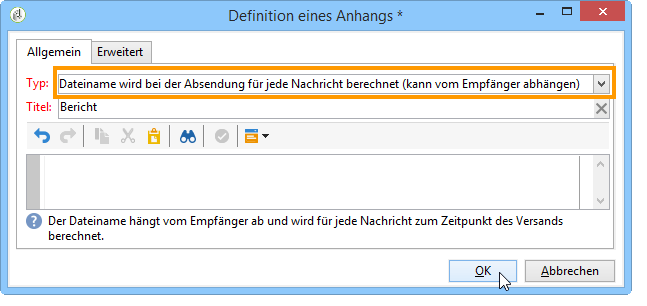 Wählen Sie im Feld Typ die Option Dateiname wird bei der Absendung für jede Nachricht berechnet (kann vom Empfänger abhängen) aus.