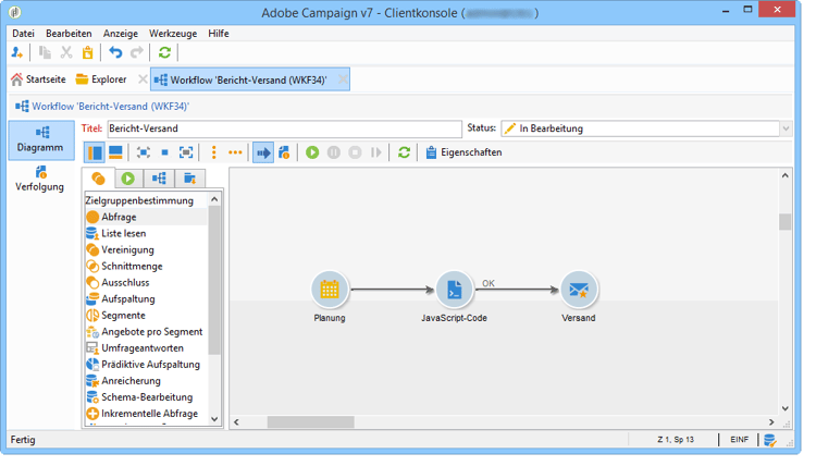 - Erstellung eines Workflows, der den Bericht im PDF-Format erzeugt und an die Empfängerliste sendet (siehe 3. Schritt: Erstellung des Workflows).
