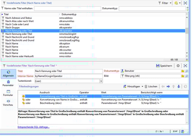 Der Knoten Administration > Konfiguration > Vordefinierte Filter enthält alle in Listen und Übersichten verwendeten Filter.