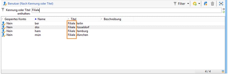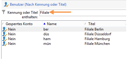 Dieselbe Liste kann mit dem Filter Nach Login oder Titel nach dem im Eingabefeld erfassten Wert durchsucht werden: