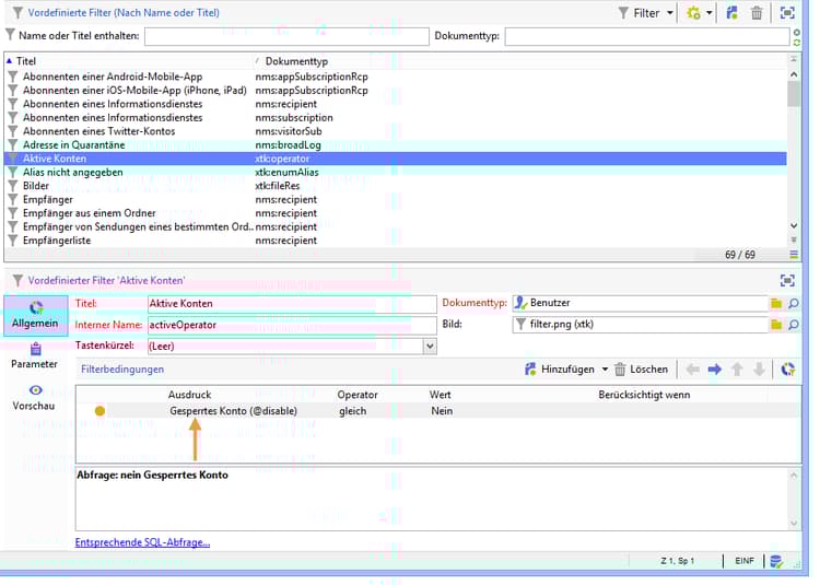 Der entsprechende Filter enthält die Abfrage bezüglich des Werts Gesperrtes Konto des Benutzer-Schemas: