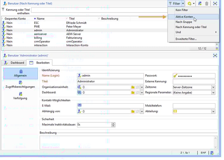 Beispielsweise kann die Benutzerliste nach Aktiven Konten gefiltert werden: