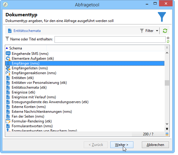 Öffnen Sie das generische Abfragetool und wählen Sie die Empfängertabelle (nms:recipient).