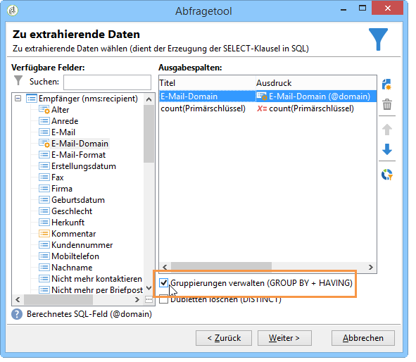 Kreuzen Sie die Option Gruppierungen verwalten (GROUP BY + HAVING) an.