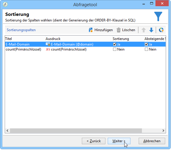 Ordnen Sie im Fenster Sortierung die E-Mail-Domains in absteigender Reihenfolge. Kreuzen Sie hierfür in der Spalte Absteigende Sortierung die Option Ja an. Klicken Sie auf Weiter.