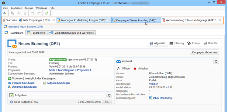 Die Benutzeroberfläche für den Web-Zugriff ähnelt der Benutzeroberfläche der Konsole. Von einem Browser aus können Sie dieselben Funktionen zum Navigieren und Anzeigen wie in der Konsole verwenden, aber Sie können nur einen reduzierten Satz von Aktionen für Kampagnen durchführen. Sie können beispielsweise Kampagnen anzeigen und abbrechen, aber keine Kampagnen ändern. So wird beispielsweise für einen Benutzer in der Konsole eine Kampagne mit folgenden Optionen angezeigt: