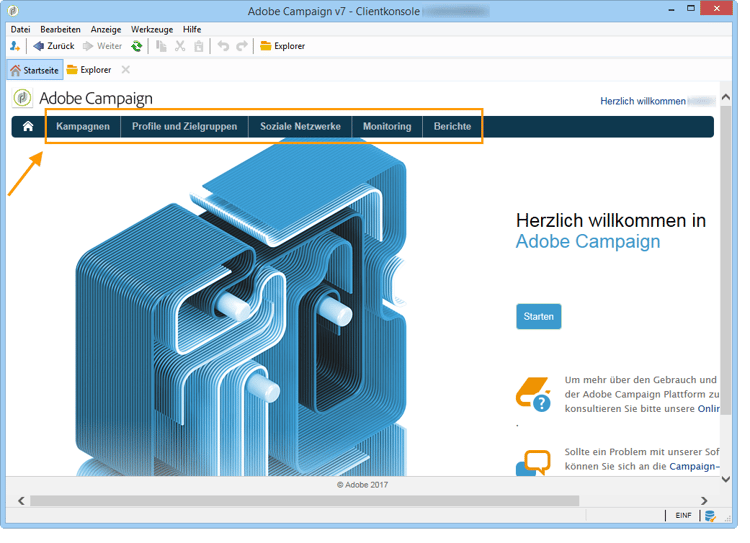 Sobald Sie mit der Datenbank verbunden sind, rufen Sie die Startseite von Adobe Campaign auf. Diese Seite ist Ihr Dashboard: Sie besteht aus Links und Tastaturbefehlen, über die Sie je nach Installation und allgemeinen Plattformkonfigurationen auf Funktionen zugreifen können.