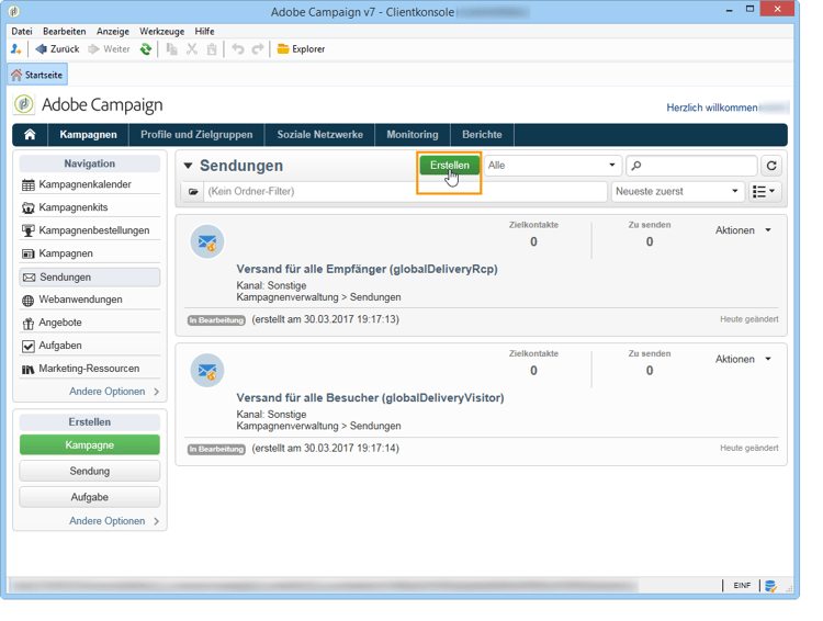 Auf die Adobe Campaign-Plattform kann entweder über eine Konsole oder über einen Webbrowser zugegriffen werden. Die kompatiblen Browser entnehmen Sie der Kompatibilitätsmatrix.