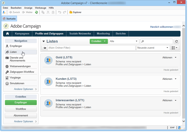 Listen z. B. sind somit über den Link Listen verfügbar, der sich auf der linken Seite des Fensters Profile und Zielgruppen befindet.