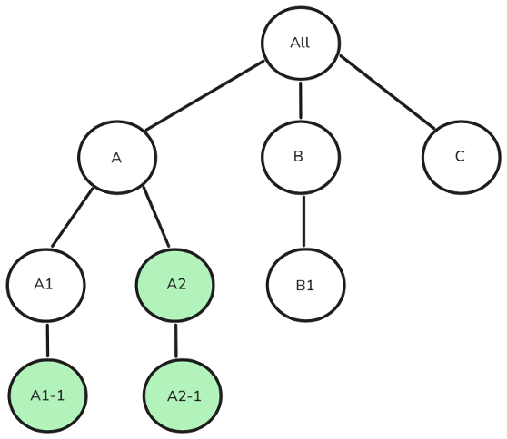 Im obigen Beispiel, bei dem ein Benutzer Zugriff auf A1-1, A2 und A2-1 hat, lauten die spezifischen Auflösungsschritte: