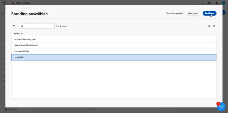 Wählen Sie auf der Registerkarte Allgemein aus der Dropdown-Liste Branding Ihre Marke aus.