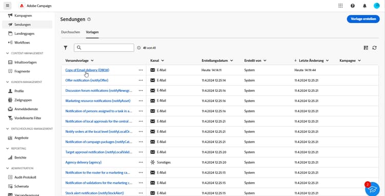 Wählen Sie als Kanal „E-Mail“ oder „Push-Benachrichtigung“ aus und wählen Sie eine Versandvorlage aus der Liste.
