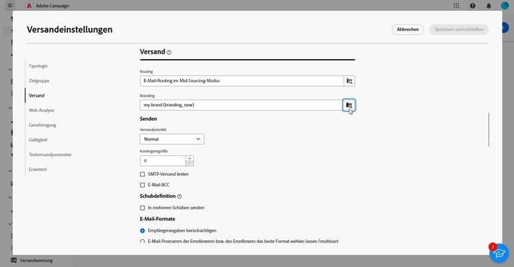 Greifen Sie auf der Registerkarte Versand auf das Feld Branding zu.