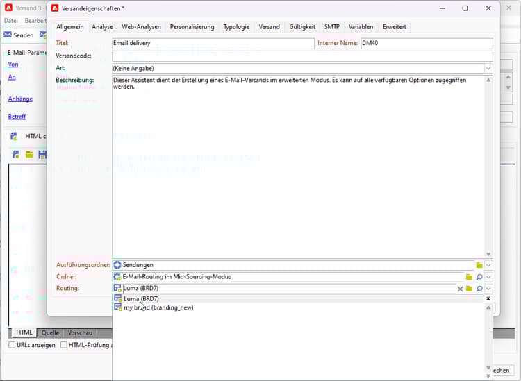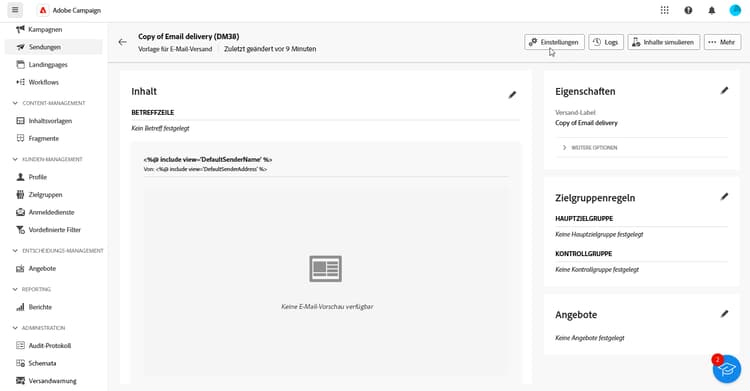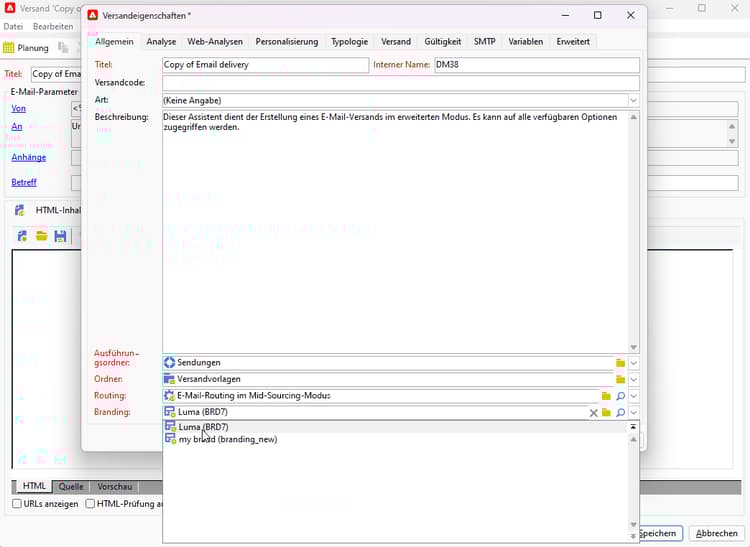 Ihre Vorlage wird mit der Marke verknüpft. Im E-Mail-Editor werden die für die Marke konfigurierten Daten in den Feldern Standard-E-Mail-Adresse des Absenders, Standard-Absendername oder Logo verwendet.