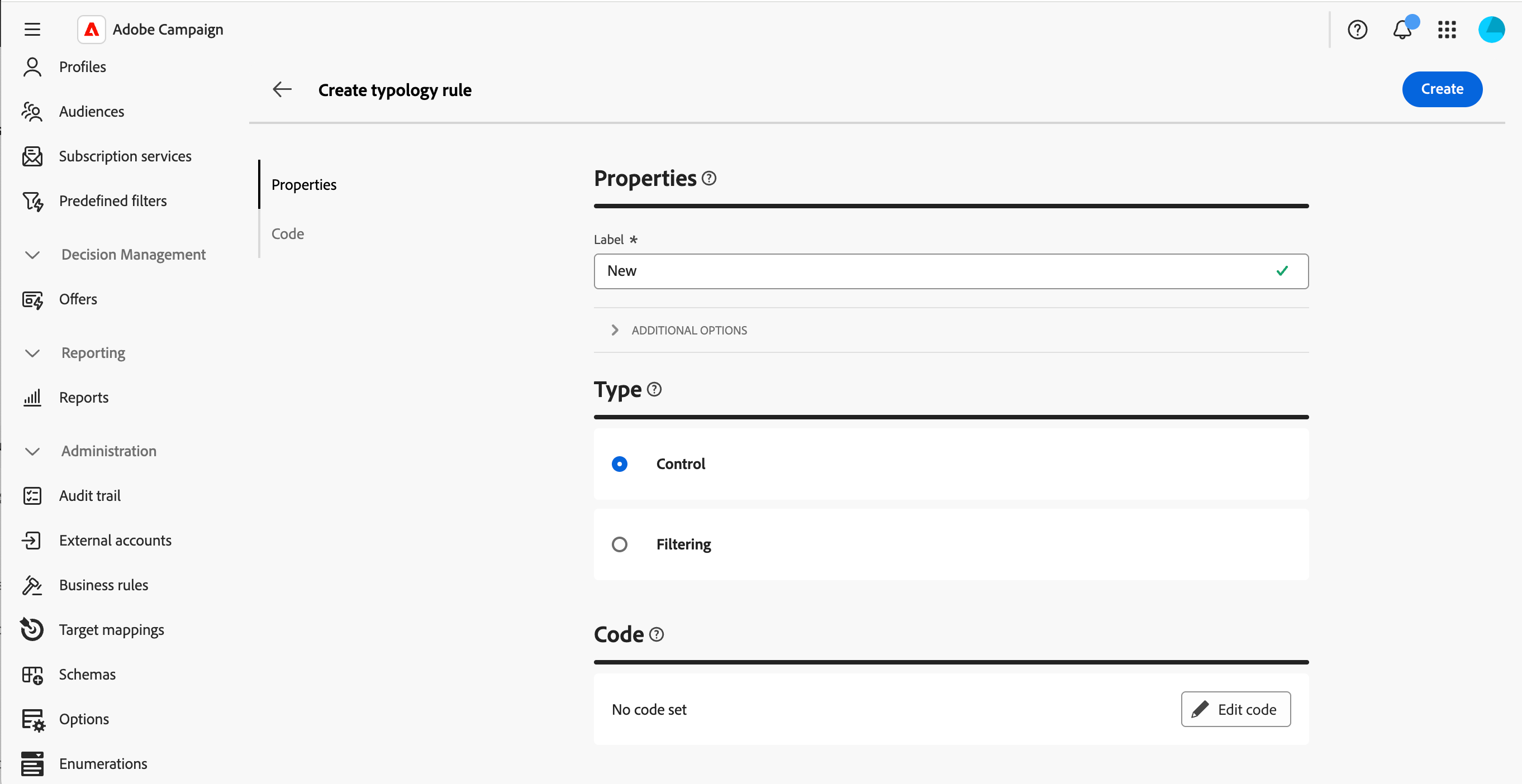 Klicken Sie auf die Schaltfläche Typologie erstellen und geben Sie ein Label für die Typologie ein.