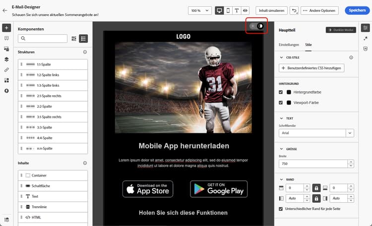 Sie können im E-Mail-Designer in die Ansicht im dunklen Modus wechseln und bestimmte benutzerdefinierte Einstellungen definieren, die dann von den unterstützenden E-Mail-Clients angezeigt werden. Weitere Informationen