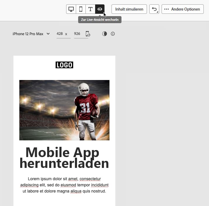 Darüber hinaus können Sie mit dem E-Mail-Designer von Adobe Campaign das Design für verschiedene Geräte und Bildschirmgrößen in der Vorschau anzeigen und optimieren. Sie können jederzeit die Option Zur Live-Ansicht wechseln wählen, um zu überprüfen, wie Ihre Inhalte auf verschiedenen Gerätegrößen gerendert werden.