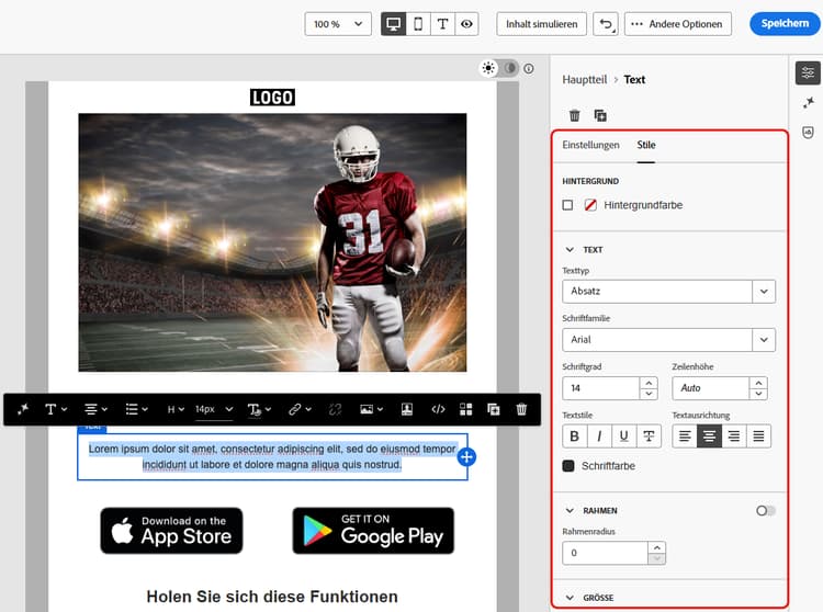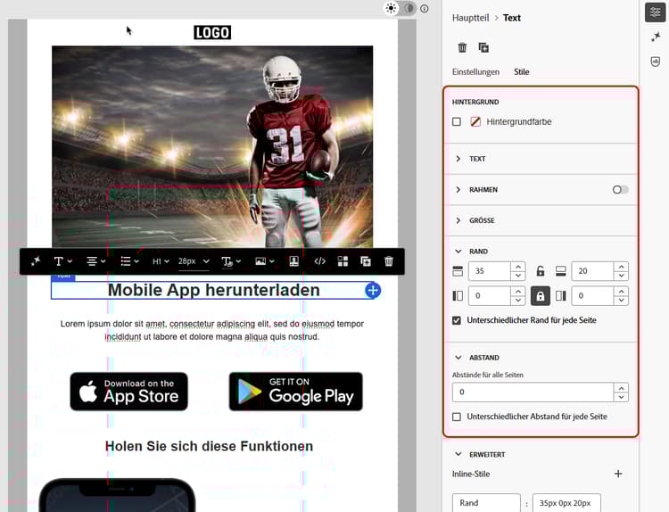 In Adobe Campaign können Sie die Größe und den Abstand der verschiedenen Elemente in Ihrem Content mithilfe der Stilparameter und -attribute im Bereich Stile von E-Mail-Designer weiter verfeinern. Weitere Informationen