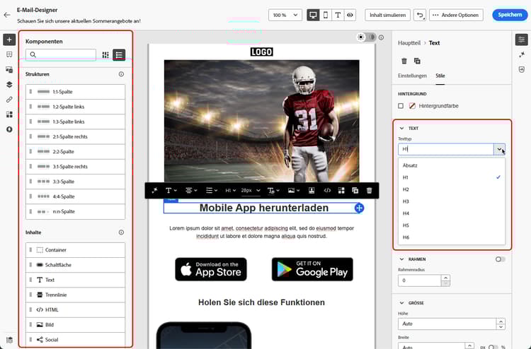 Verwenden Sie die für E-Mail-Designer relevante Struktur und Inhaltskomponenten sowie die Optionen im Bereich Stile, um Ihren Content übersichtlich, logisch und präzise anzuordnen, sodass er für alle zugänglich ist.