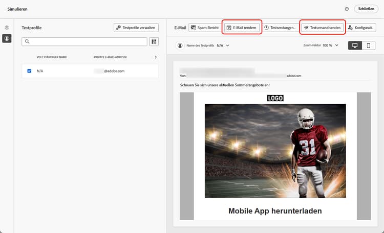 Führen Sie Testsendungen durch, um das Rendering Ihrer Inhalte zu testen, bevor Sie sie an Ihre echte Zielgruppe senden. Weitere Informationen