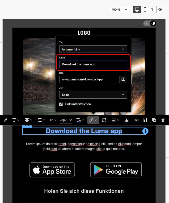 Verwenden Sie den E-Mail-Designer, um einen Link zu Ihrem Inhalt hinzuzufügen und das Label zu bearbeiten, damit es erkennbar (sichtbar) und beschreibend (klar bezüglich des Zwecks) ist. Vermeiden Sie vage Labels wie „hier“ oder „mehr“.