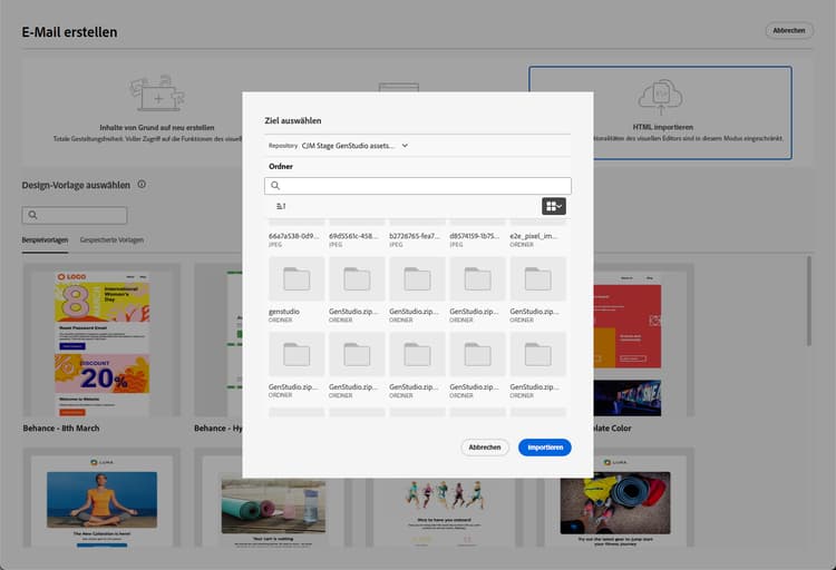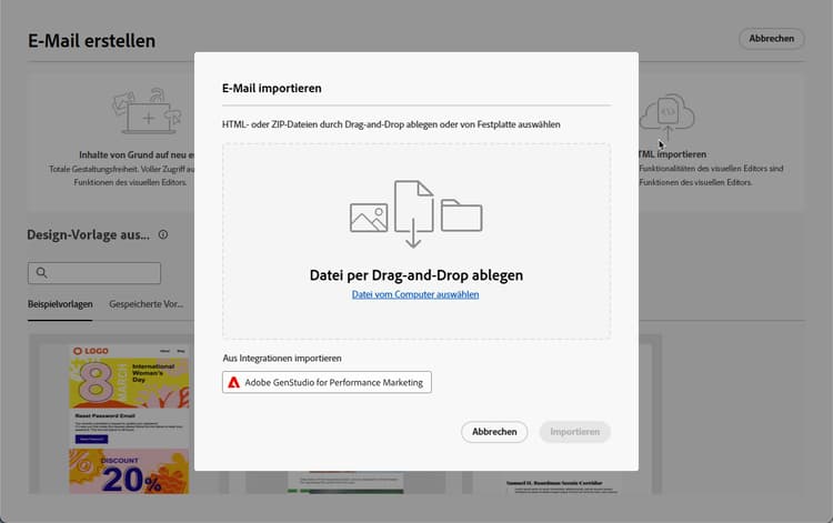 Wählen Sie auf der Startseite des E-Mail-Designers HTML importieren aus und klicken Sie auf die Schaltfläche Adobe GenStudio for Performance Marketing.