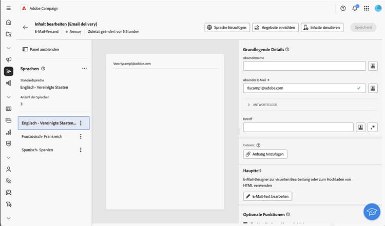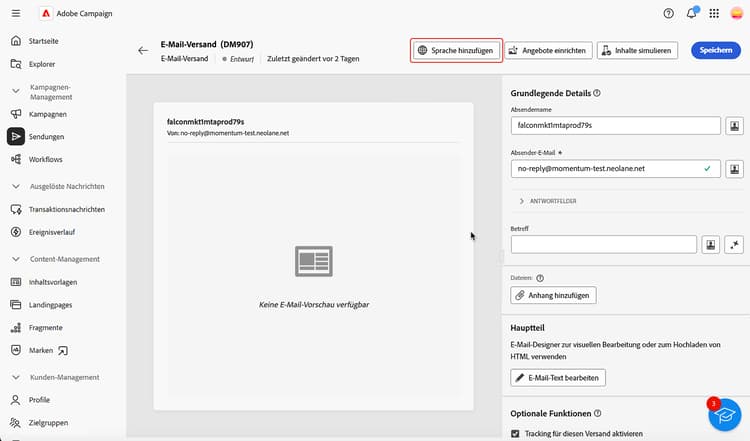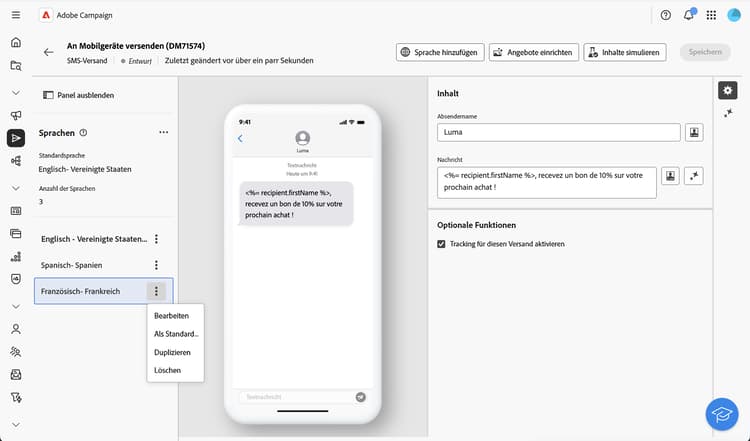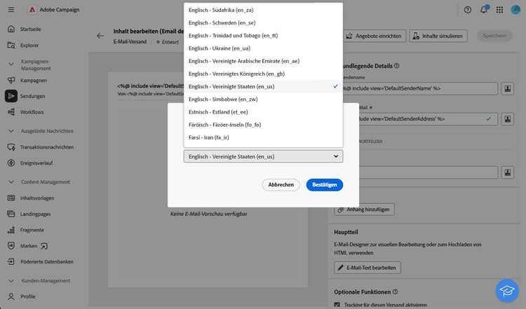 In der Campaign Web-Benutzeroberfläche können Sie Ihre Sendungen als mehrsprachig einrichten, sodass Sie Nachrichten basierend auf der bevorzugten Sprache eines Profils senden können. Wenn keine Voreinstellung definiert ist, wird die Nachricht in der Standardsprache gesendet.