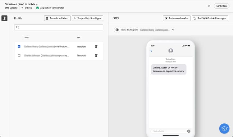 Um eine Vorschau des Versands anzuzeigen, klicken Sie auf die Schaltfläche Inhalte simulieren und wählen Sie „Profile“ aus. Stellen Sie sicher, dass für jedes Profil der richtige Inhalt angezeigt wird.