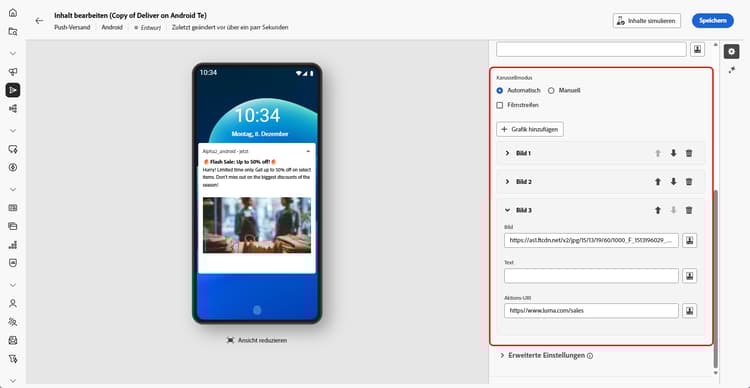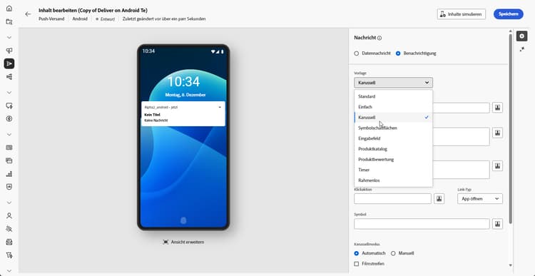Karussell ermöglicht es Ihnen, Benachrichtigungen mit Text und mehreren Bildern zu senden, zwischen denen die Benutzenden hin und her wischen können.