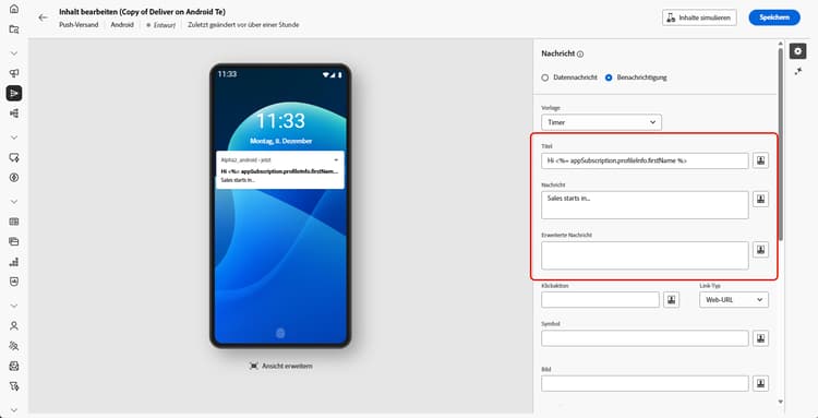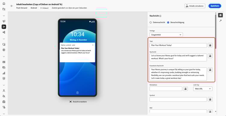 Fügen Sie die URL hinzu, die die Klick-Aktion definiert, die mit einem Benutzerklick auf Ihre Benachrichtigung verbunden ist. Dies bestimmt das Verhalten bei der Interaktion der Benutzenden mit der Benachrichtigung, z. B. beim Öffnen eines bestimmten Bildschirms oder beim Ausführen einer bestimmten Aktion in der App.