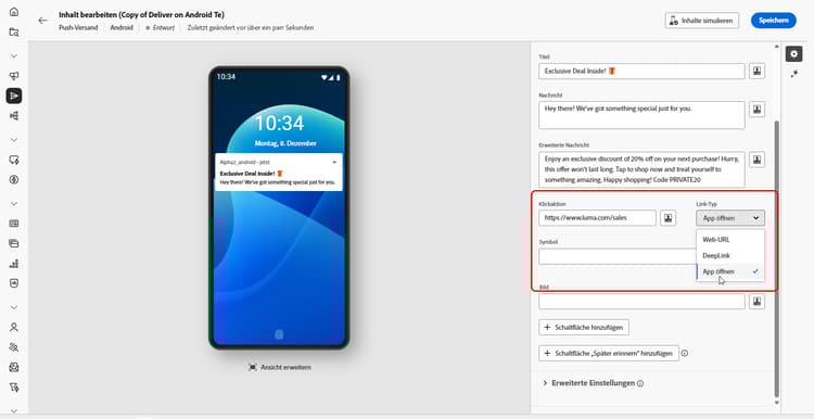 - Link-Typ: Wählen Sie als Link-Typ entweder Web-URL, Deeplink oder Open App.