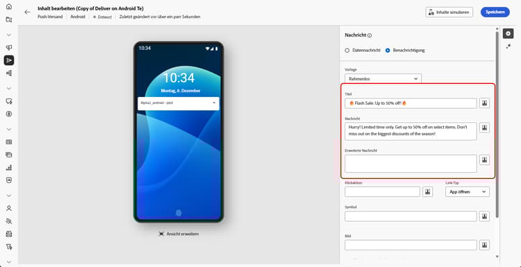 Um Ihre Nachricht zu erstellen, geben Sie Ihren Text in die Felder Titel, Nachricht und Erweiterte Nachricht ein.