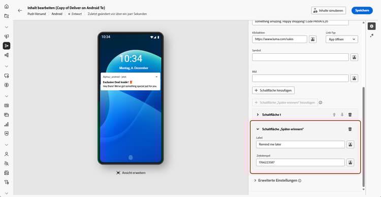 Sie haben die Möglichkeit, bis zu drei Schaltflächen in Ihre Push-Benachrichtigung einzubauen. Wenn Sie sich für die Schaltfläche „Später erinnern“ entscheiden, können Sie maximal zwei Schaltflächen einfügen.