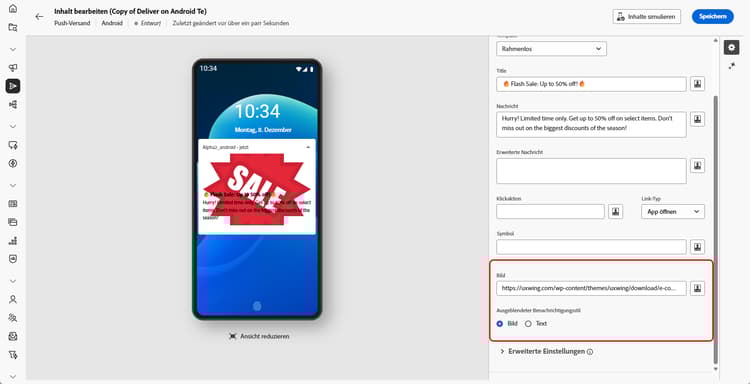 Push-Benachrichtigungen können weiter personalisiert werden. Dazu können Sie eine Bild-URL auswählen, die der Push-Benachrichtigung hinzugefügt werden soll, sowie das Symbol der Benachrichtigung, das auf den Geräten Ihrer Profile angezeigt werden soll.