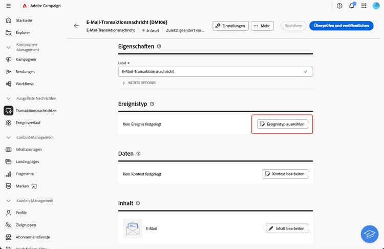 Gehen Sie im Abschnitt Ausgelöste Nachrichten zu Transaktionsnachrichten und erstellen Sie eine neue Transaktionsnachricht.