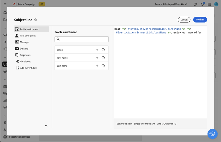 Wenn Sie Personalisierung verwenden, z. B. in der Betreffzeile, fügen Sie über das Menü Profilanreicherung die zuvor definierten profilbasierten Felder hinzu.