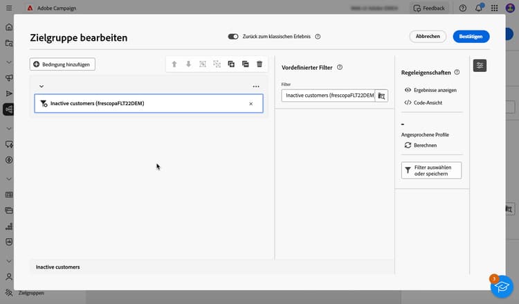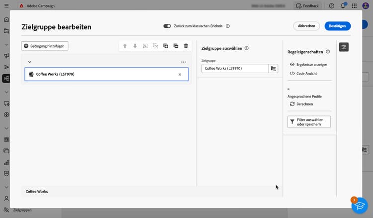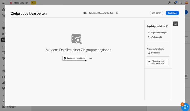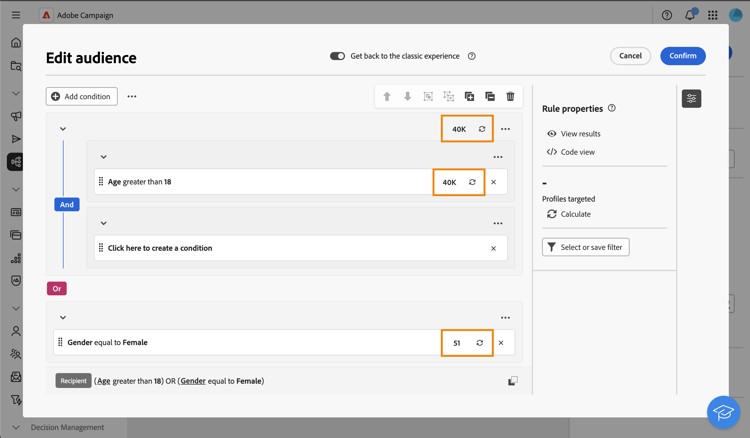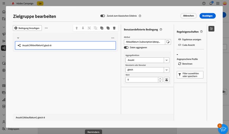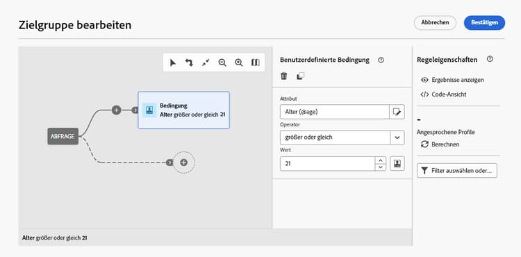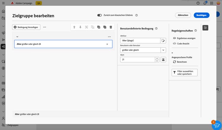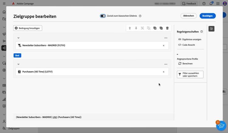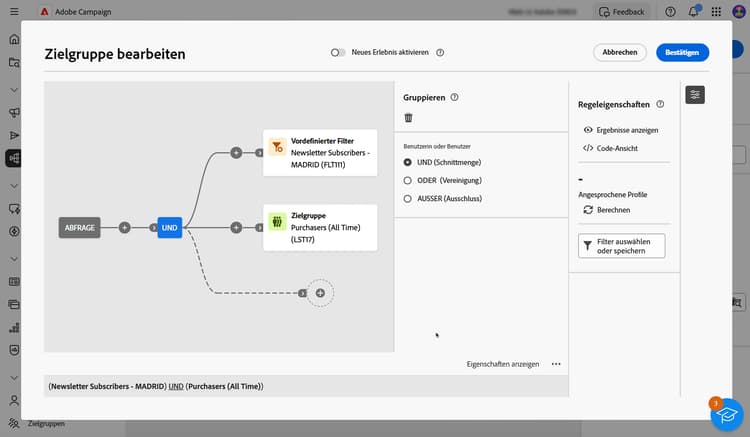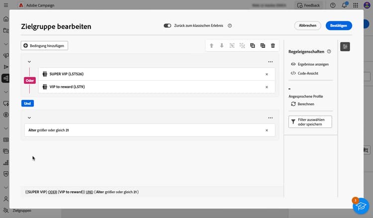 Bei Verwendung des neuen Regel-Builders können Sie die Zielpopulation direkt für jede Bedingung und Gruppe anzeigen: