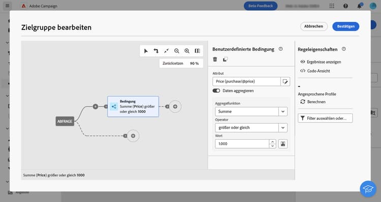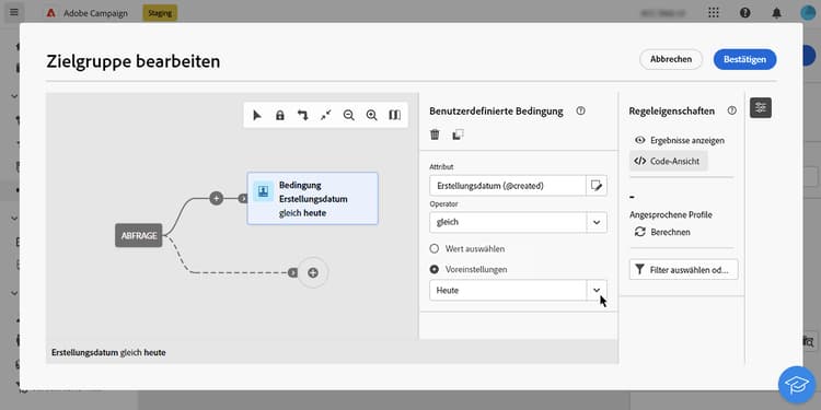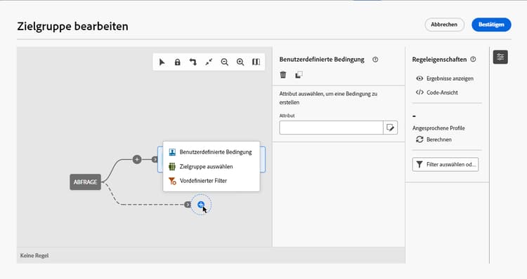 Nachdem Sie Ihre Abfrage auf der Arbeitsfläche erstellt haben, können Sie sie über den Bereich Regeleigenschaften auf der rechten Seite überprüfen. Dieser Bereich wird beim Einrichten einer Abfrage zum Erstellen einer Zielgruppe angezeigt. Verfügbare Operationen sind: