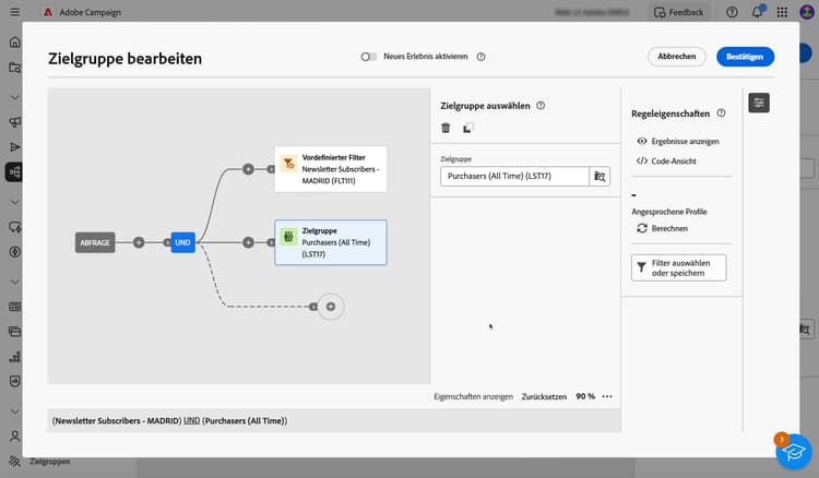 In diesem Beispiel haben wir für die zweite Transition neue Zielgruppentyp-Filterkomponenten hinzugefügt. Die Komponente ist mit der vordefinierten Filterbedingung durch einen UND-Operator verknüpft, d. h. die Abfrageergebnisse enthalten Empfängerinnen und Empfänger, auf die der vordefinierte Filter „Newsletter-Abonnenten - MADRID“ zutrifft UND die zur Zielgruppe „Käufer (gesamte Zeit)“ gehören.