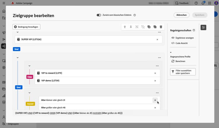 Beispiel: *Empfangende belohnen, die „Super VIP“ UND „Zu belohnende VIP“ ODER „VIP Demo“ sind AUSSER Empfangende im Alter unter 21 Jahren und über 45 Jahren.
