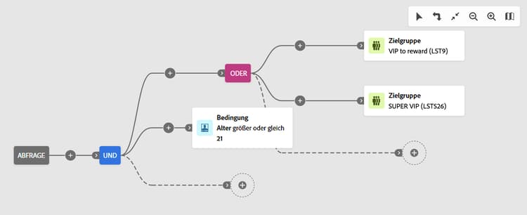 Im folgenden Beispiel haben wir eine Zwischengruppe erstellt, um Ergebnisse aus den Zielgruppen „Zu belohnende VIP“ oder „Super VIP“ einzubeziehen.